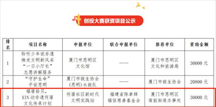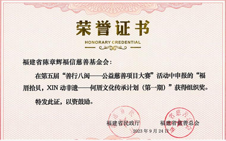 After nearly four months of strict assessment, such as project application, preliminary evaluation and screening, expert training, and final roadshow, the party building+culture project of "picking up shells in Fucuo, XIN movable intangible heritage" - Hecuo Cultural Heritage Plan "selected by Chen Zhanghui Fuxin Charity Foundation stood out from 62 projects, ranked third, and won the highest amount of venture capital funding. In addition, the project also won the organization award of the fifth "Good deeds in Bamin - Public Welfare Charity Project Competition" directed by the Department of Civil Affairs of Fujian Province and hosted by Fujian Charity Federation.